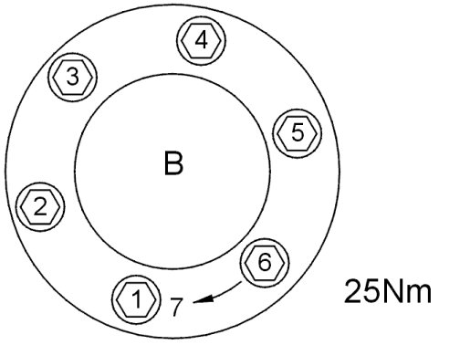 - Tighten screws (1) to (6) in numerical order as per the illustration (B) to 25 Nm and finally screw (1) again.