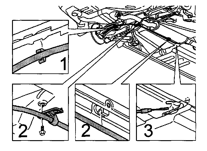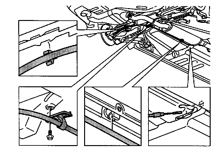 Press the mechanical cable into place in its mounting between the heat shield and the fuel tank.