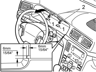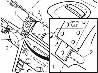 - Mark out the holes for the car-phone holder (1). First align the edge of the holder with the edge of the hole (2). Press the holder upwards by 3 mm (7/64"). Drill a hole using a 5 mm (13/64") drill bit. Use a 20 mm (3/4") drill stop