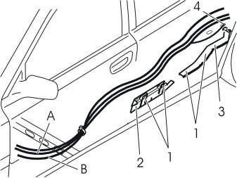 - Route the cables (1) under the carpet along the left side of the car to the rear door