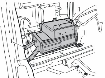- Install the bracket with the CD changer / DVD reader behind the wheel arch. Use the four screws (1) from the kit. See the illustration. Tighten the screws. Tighten to 10 Nm (7 lbf ft).