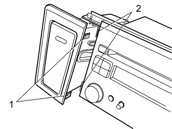 - Press the mug holder into place beside the radio. Ensure that the mug holder catches (1) engage in the corresponding hooks (2) on the radio.