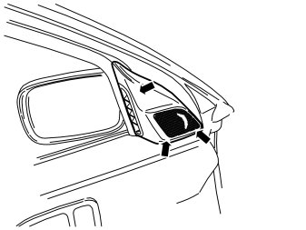 - Remove the small panel/loudspeaker grille at the front/upper edge of the door. Carefully pry off the panel using a weatherstrip tool, opposite the three clips.