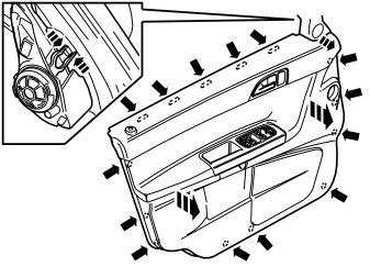 - Disconnect the door panel from the door. Carefully pry off the panel opposite the nine clips at the sides and bottom. Use a weatherstrip tool. Pull the top edge of the panel until the five clips release. Press together the two catches (see inset) which hold the bracket for the treble loudspeaker to the door. The door panel releases at this point