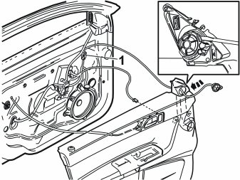 - Take out the new treble loudspeaker and cable harness. Insert the cable harness at the front edge of the hole in the bracket for the treble loudspeaker. There is limited space in the hole, but there is just enough room for the connector to pass through. Route the cable harness on the inside of the door panel so that the cable harness is between the door panel and the air duct