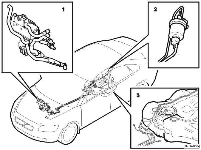 3. Fuel hoses / pipes with suction hose on the fuel tank unit, suction and pressure hoses to and from the fuel pump (FP) above the fuel tank (2), as well as pressure hoses / pipes under the vehicle, parallel with other fuel hoses / pipes, up to the heater unit.