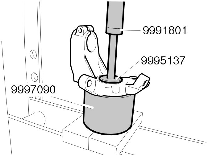 Secure the wheel knuckle in a hydraulic press. Use socket: 999 7090 Press tool 999 7090 Press Tool and drift: 999 1801 STANDARD SHAFT 999 1801 Standard Shaft with: 999 5137 PUNCH 999 5137 Punch.