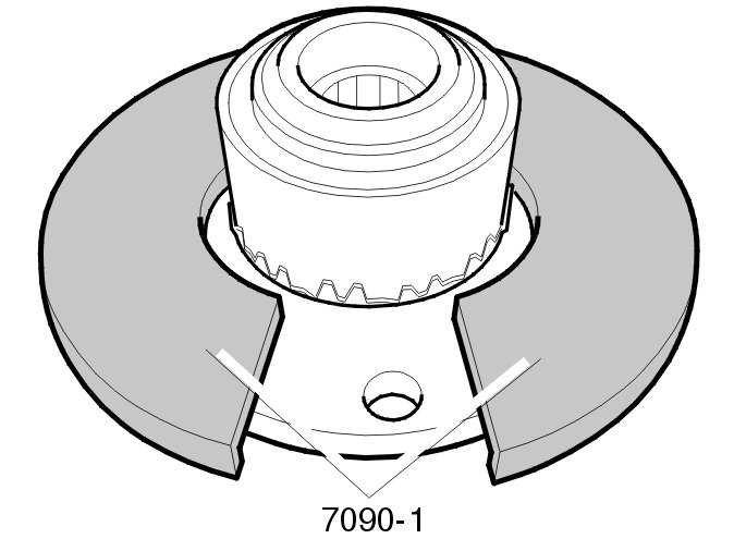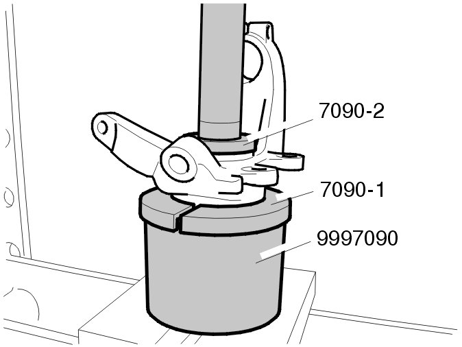 Position the bearing together with 7090-1 on socket: 999 7090 Press tool 999 7090 Press Tool. Position the wheel spindle and drift 7090-2. Press in the bearing.