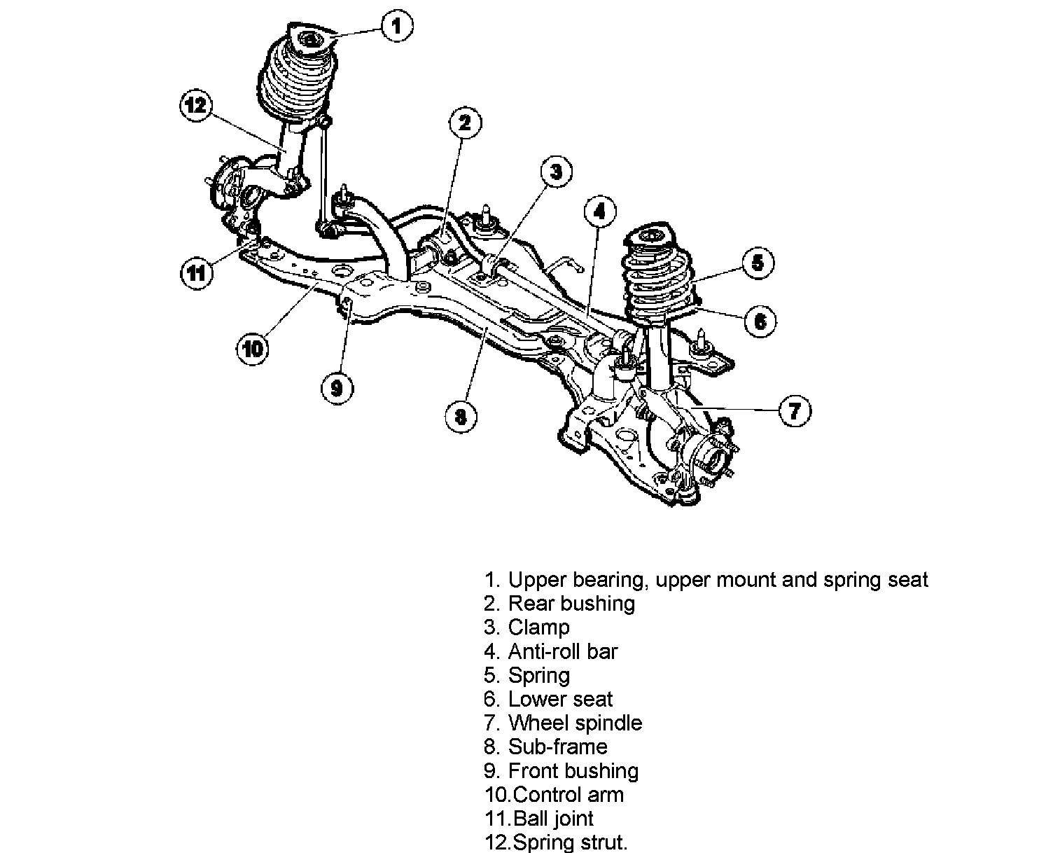 The front suspension is of the McPherson type, which means that the wheels are independently sprung. The suspension on either side consists of: sprint strut (12), control arm (10) and wheel spindle (7). The anti-roll bar (4) is secured in the sub-frame (8) with two clamps (3) and in the spring strut (12). There are a number of anti-roll bar variants.