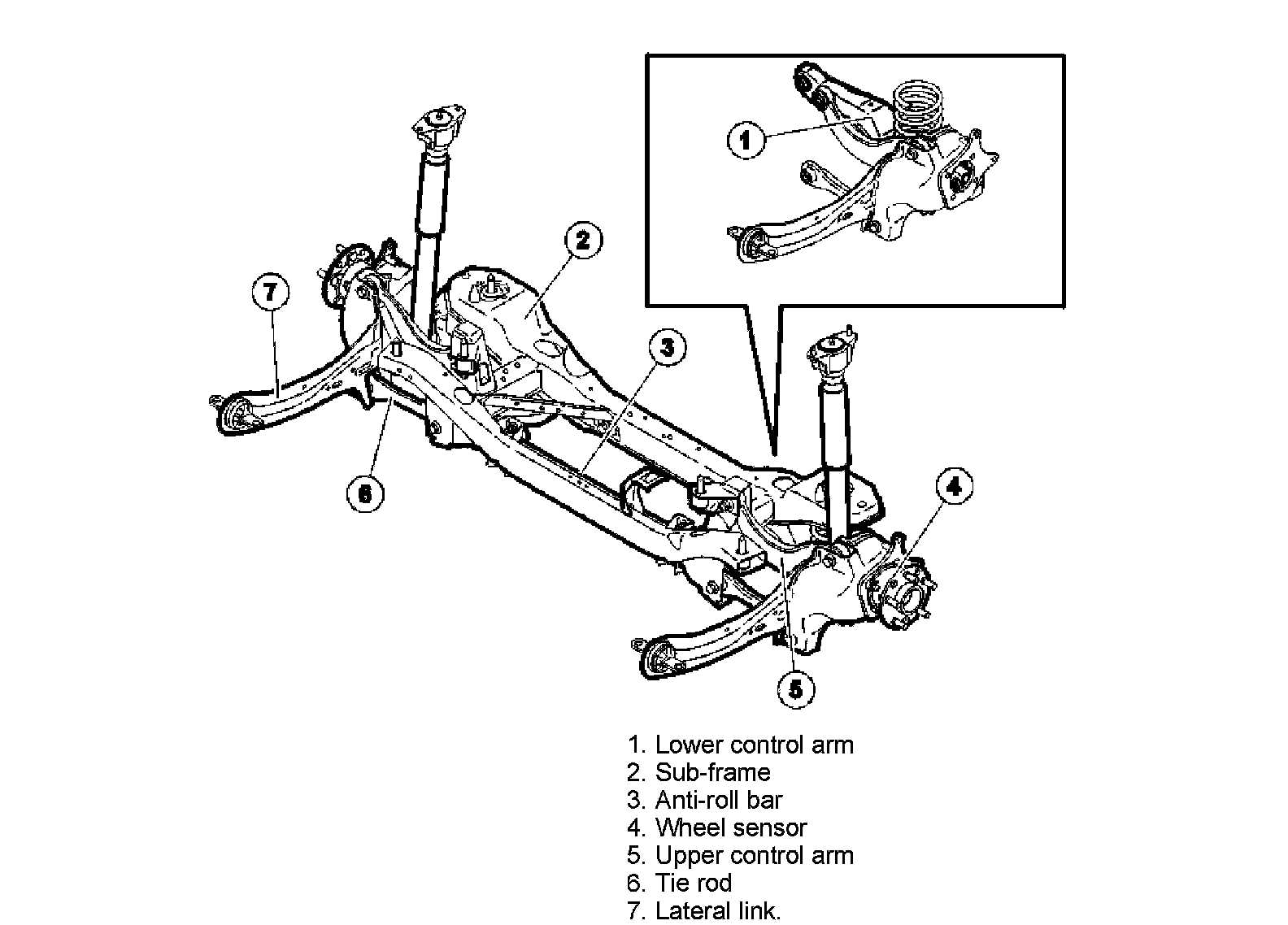 The sub-frame (8) is made of two welded plates and a number of smaller plates. The rear bushing (2) is bolted to the sub-frame.