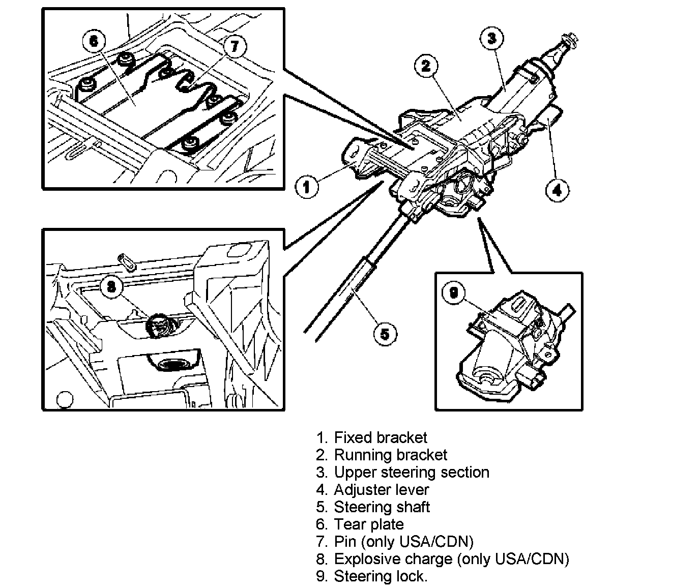 The pin (7) engages. This results in the tear plate using its entire structure to absorb energy. The deformation takes place stiffly and slowly. Driver wearing seat belt: The explosive charge (8) is activated and pushes down the pin (7) out of the tear plate (6). The tear plate is weakened and the kinetic energy of the collision is transferred on in the system. This produces a relatively soft deformation process. The collision protection system only works if the driver is wearing a seat belt and the airbag deploys.