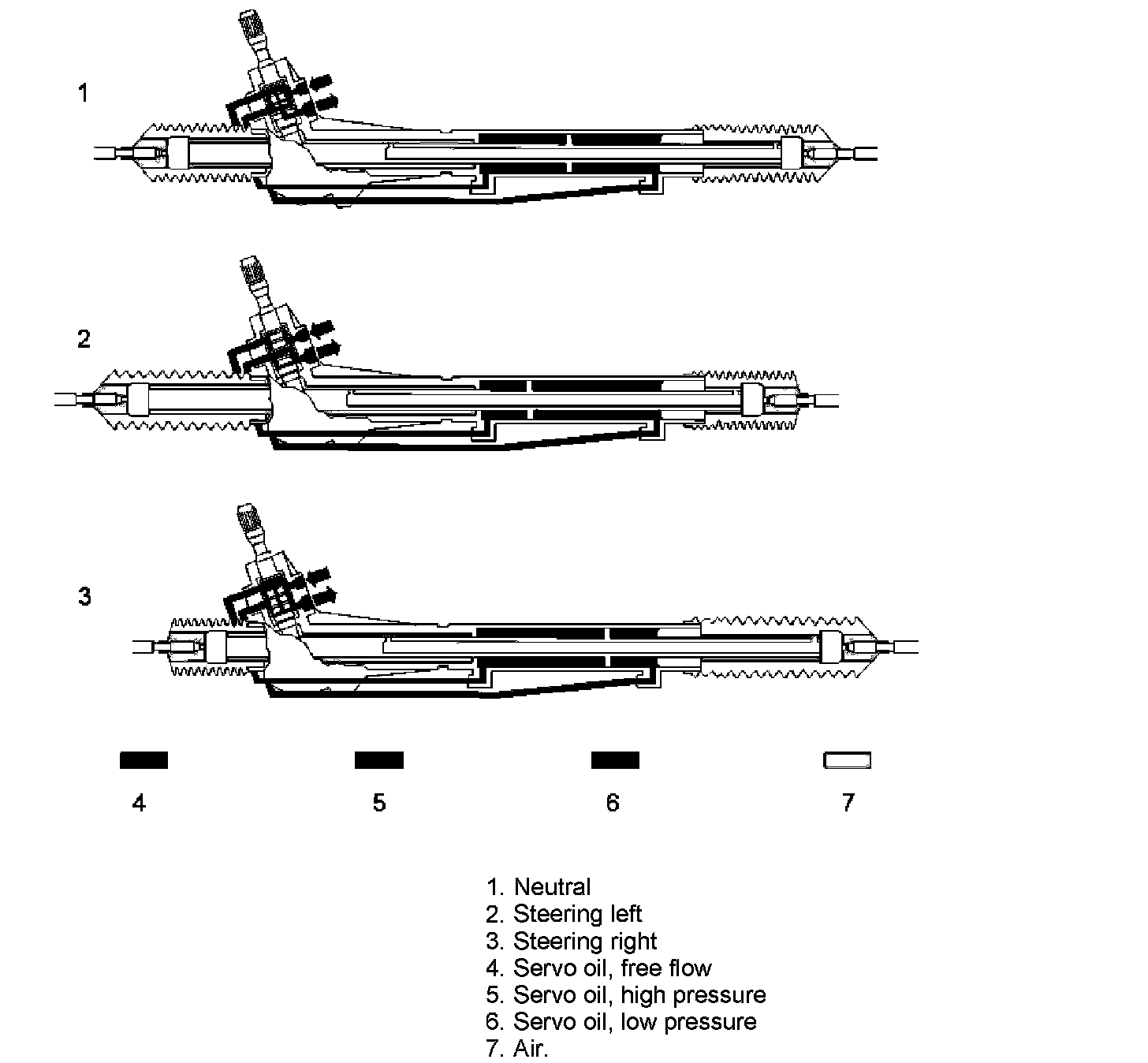 The force of oil pressure built up in the power steering pump affects the piston on the steering rack. The oil flow to the right or left-hand side of the piston is regulated in the valve housing. External pipes lead to both sides from the valve housing. The power steering pump pressure hose is connected to the valve housing.