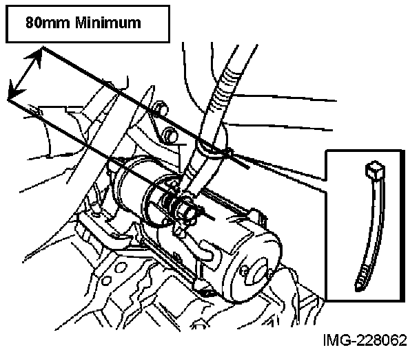 Install a tie strap at least 80 mm (3 inches) from the centerline of the B+ cable terminal as high up as possible, if not already installed. See the illustration.