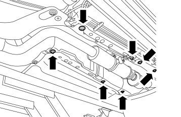 Detach the front heat deflector plate from the studs and pull it down towards the exhaust system, sliding it forward slightly.