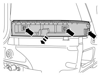 - Remove the left end of the dashboard by first prying it (1) with a weatherstrip tool until the two pawls release, then pull it off backwards (2)