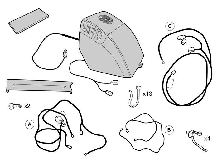 Note! The work is done in the same way on left-hand and right hand drive car. Left-hand drive is shown. In case the work differs, right hand drive version is also shown.On cars with pre-wired connector to 12V socket (two-pin black connector located under right tail light), the cable harness A and B in the kit shall be used. On cars without this connector, use all three cable harnesses in the kit.