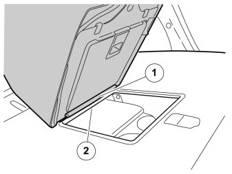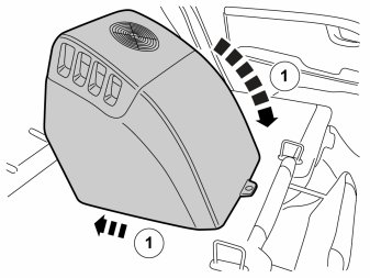 - Place the cooler over the hole in the backrest so that the rail (1) in the cooler can be slid over the edge (2) in the hole in the backrest when it is pushed backward.