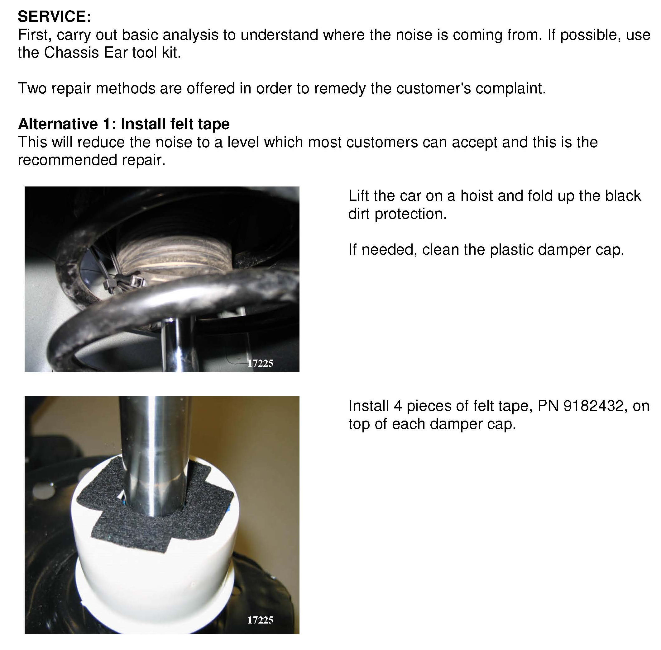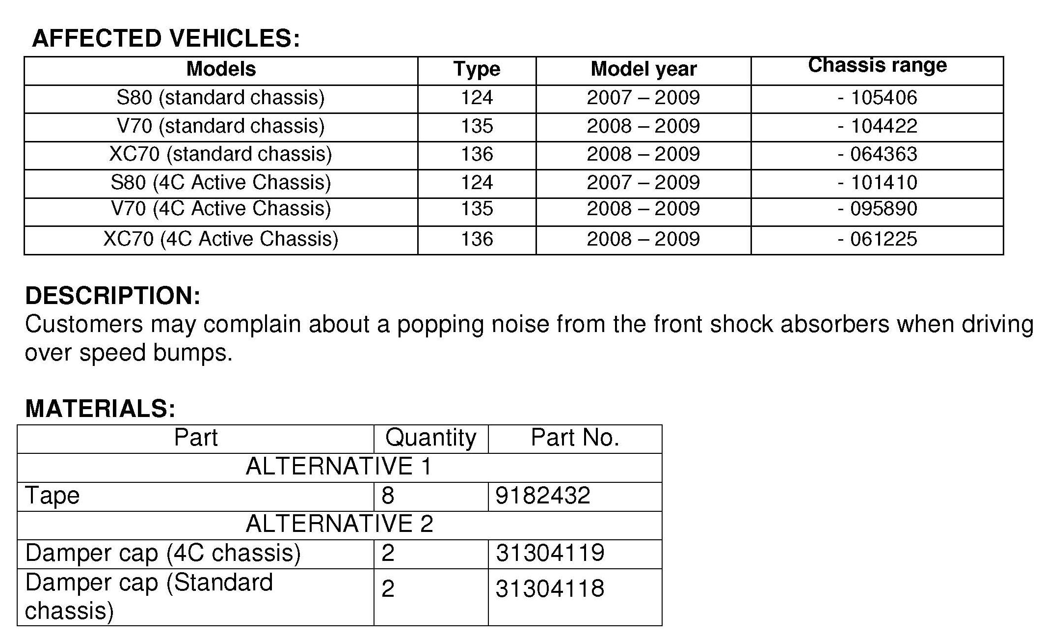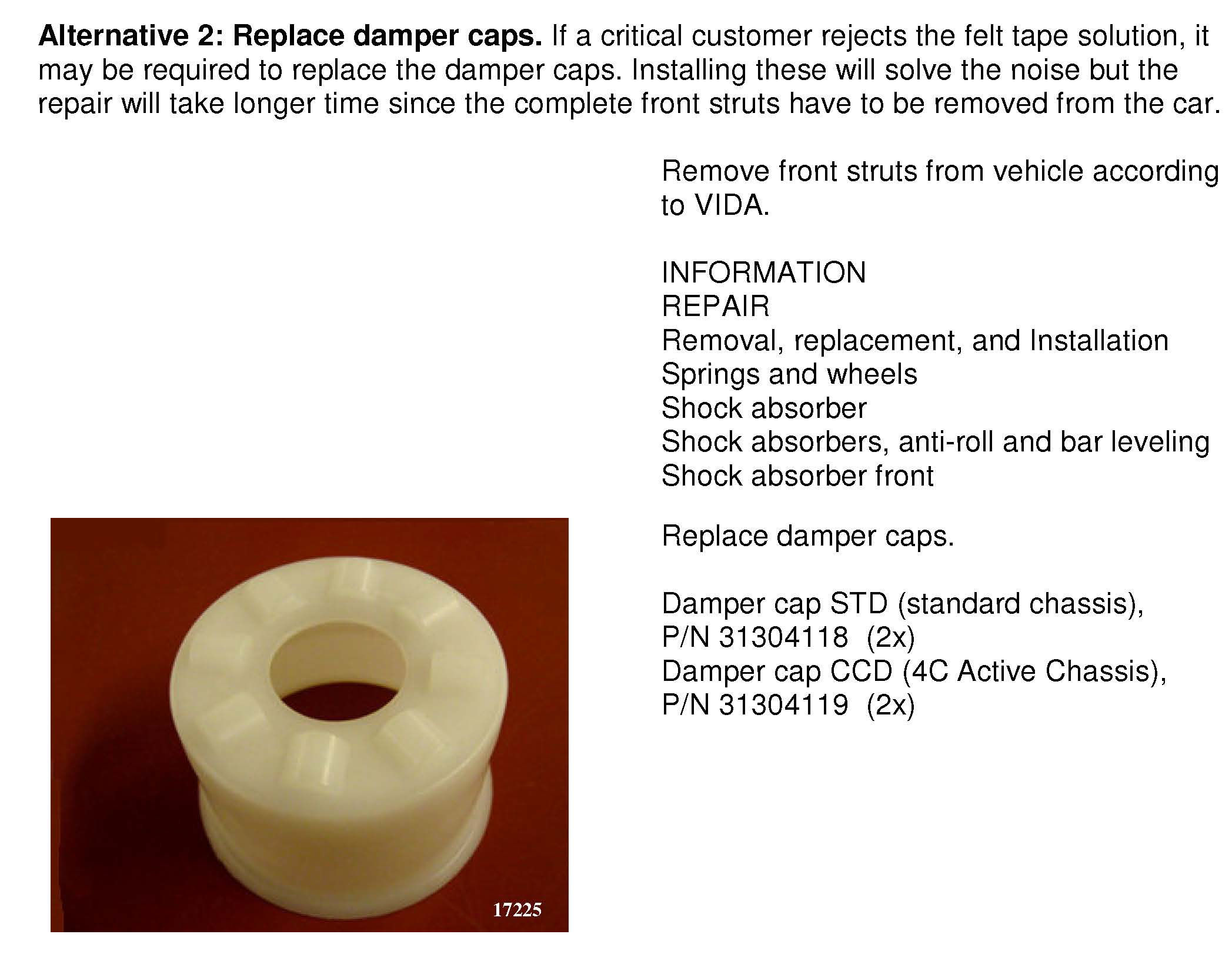 A new damper cap on the shock absorber was introduced from structure week 2008w48 (CCD - 4C shock absorber) and from 2009w12 (STD - standard shock absorber). See chassis ranges in attachment.