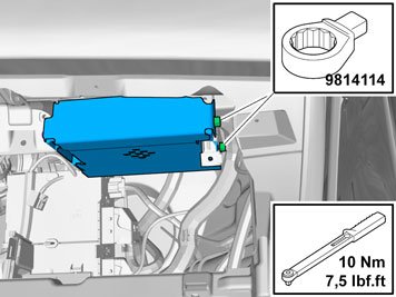 - Install the control module with brackets and tighten the three existing screws and security screw. Use insertion sleeve part.no. 9814114 when torque tightening. Ensure that the cables run correctly and do not risk being clamped or frayed.
