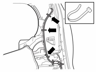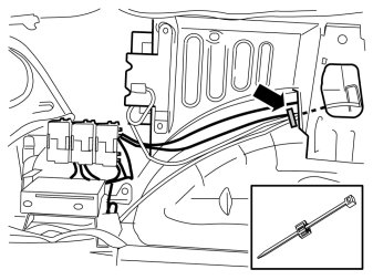 - Route the cable along the wheel housing. Install cable ties with clips to the panel flange.