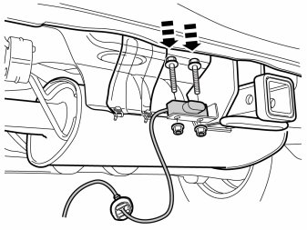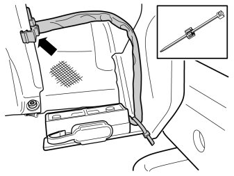 - Route the wiring harness as illustrated and clip it to the left-hand bracket for the radiation shield using a cable tie with clip. Attach the clip so that the wiring harness comes away from the sharp edge of the bracket.