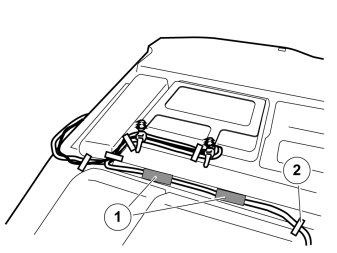 - Fasten the antenna cables with two pieces of tape (1) and a cable tie (2) in the drilled holes.