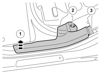 - Remove the rear sill trim panel by pulling it up at the front edge (1) and then unhooking it from the clip (2).