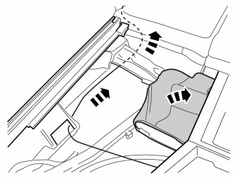 - Remove the left end of the dashboard by first prying it (1) with a weatherstrip tool until the two pawls release, then pull it off backwards (2)