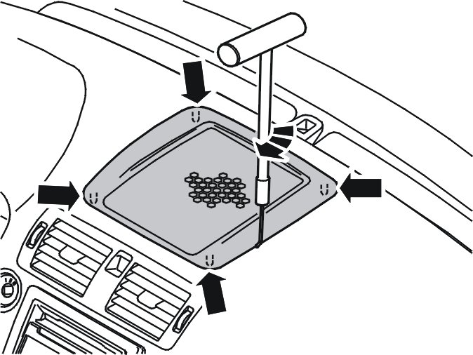 Insert special tool: 951 2943 L-hook 951 2943 L-Hook into the gap between the dashboard and the loudspeaker grill.