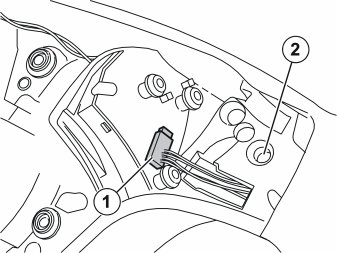 - Carefully install the new steering wheel by holding it straight and aligning the locating pins (1) on the contact reel. Route the ignition wiring for the airbag through holder (2)