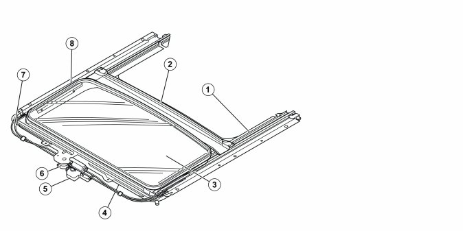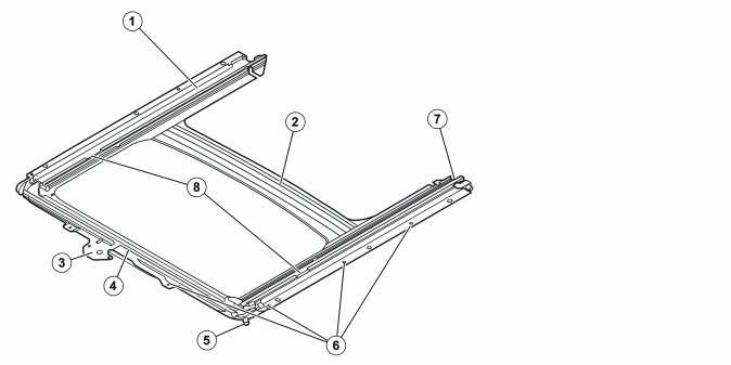The sun roof frame is designed to hold all components together and to maintain rigidity, which keeps the movements of the mechanism stable. The A-frame struts serve as guide rails (1) for the drive mechanism. The guide rails contain fixed notches (8), which are necessary for the function of the mechanism. The center member (2) is riveted between the guide rails to increase frame strength and is used for mounting the edging. The front member (4) houses mountings (3) for the motor and Sun Roof Module (SRM). There are eight mounting points (6) along the guide rails and front member to mount the sun roof in the body.