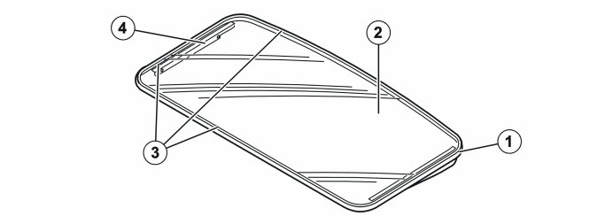 The glass panel (2) and sunshade are the visible components of the sun roof. The glass provides extra light to the drive and passengers while protecting them from cold air and rain. The panel is made of safety glass to protect the driver and passengers. It is mounted on metal reinforcements (3) and side brackets (4). The glass panel is mounted in the drive mechanism with screws in the side brackets. The reinforcements are secured to the glass with adhesive, which provides extra rigidity against impact and wind load. The glass edge is covered with a rubber seal (1) that keeps out rain water and dust.