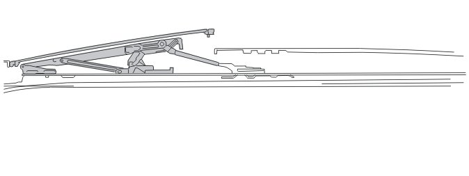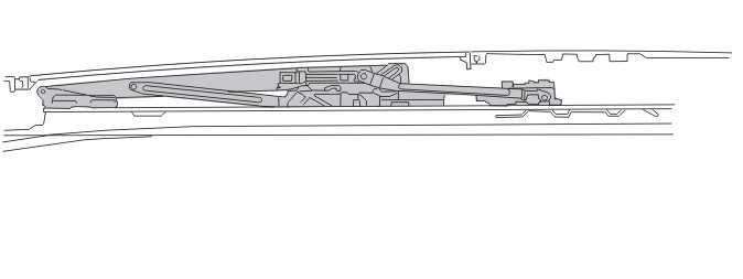 The drive mechanism is depicted above. The mechanism bears the glass panel and moves it to the various positions. The left and right mechanism each have two mounting points for the glass panel (1). The drive mechanism can move through the guide rail on carriages (2). Because the carriages slide through the rail, it must be well lubricated.