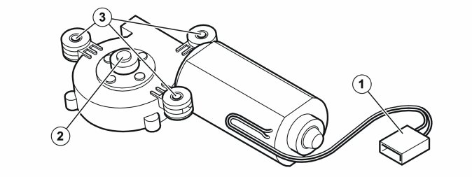 The sun roof motor is connected (1) to the Sun Roof Module (SRM), which regulates current to the motor. Nominal system voltage is 12 V. Maximum top load during normal operation is 5 A. The motor drives a gear wheel (2), which engages the drive cables and causes them to rotate. The gear wheel has a maximum torque of 2.0 Nm and the motor has thermal overload protection. The motor is mounted with screws in the three mounting points (3) in the sun roof frame.