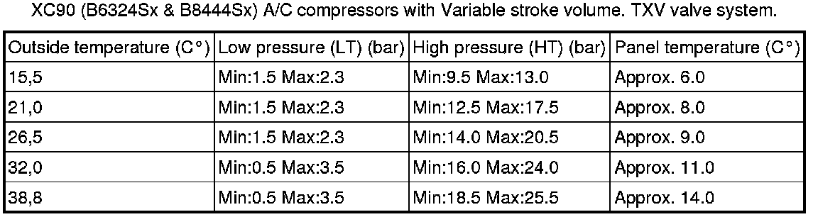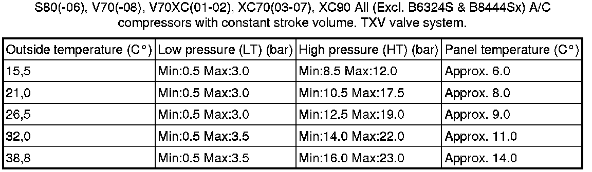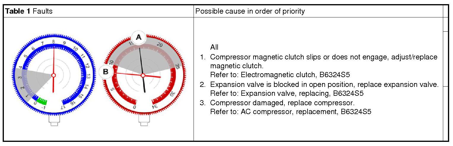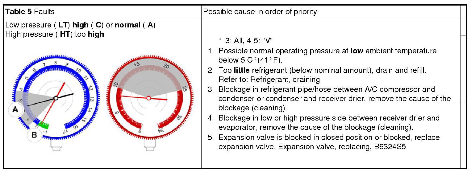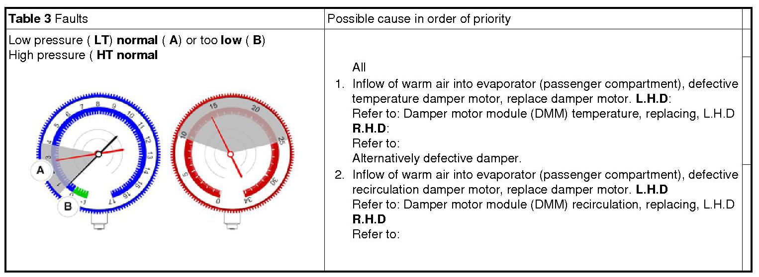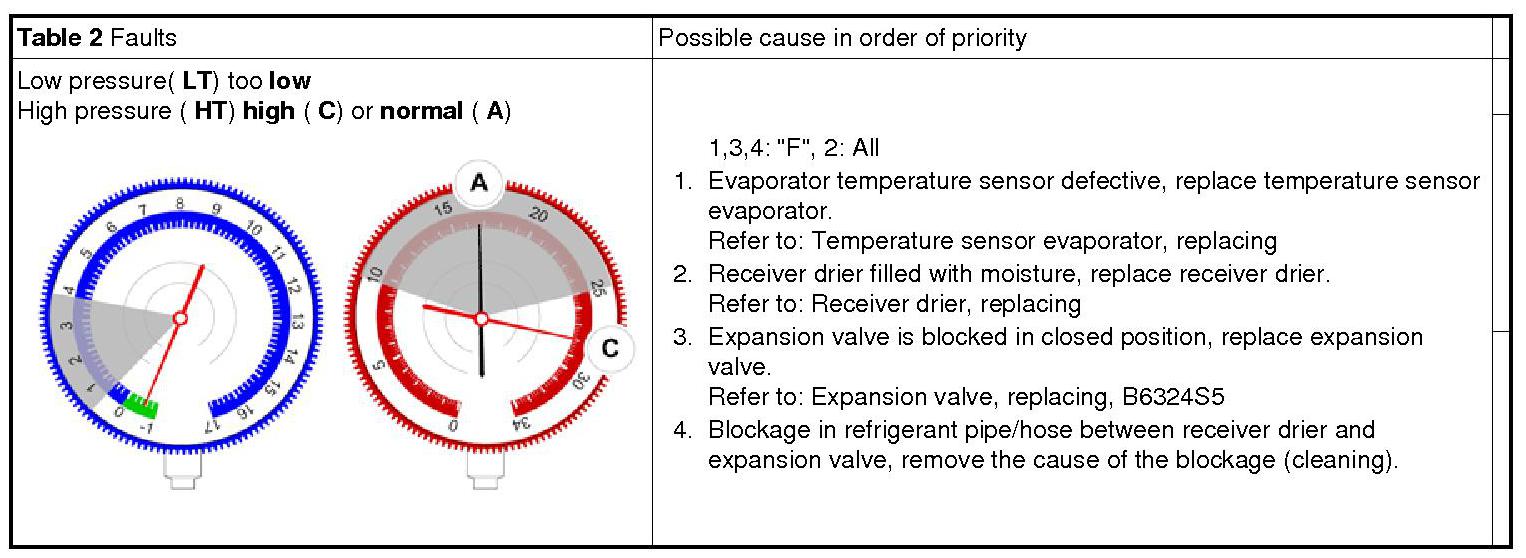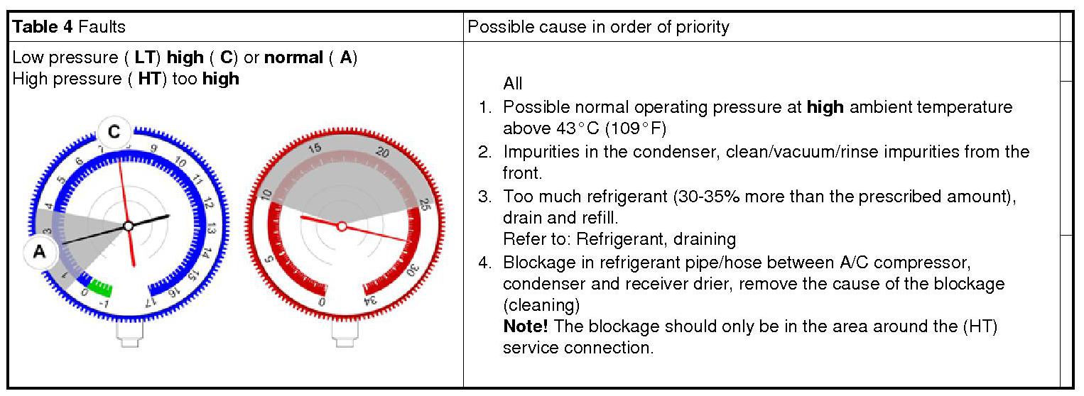 - 6 x tables represent all the different fault symptoms on Volvo Car Company A/C systems with two service valves, with tips, results and action in order of priority.