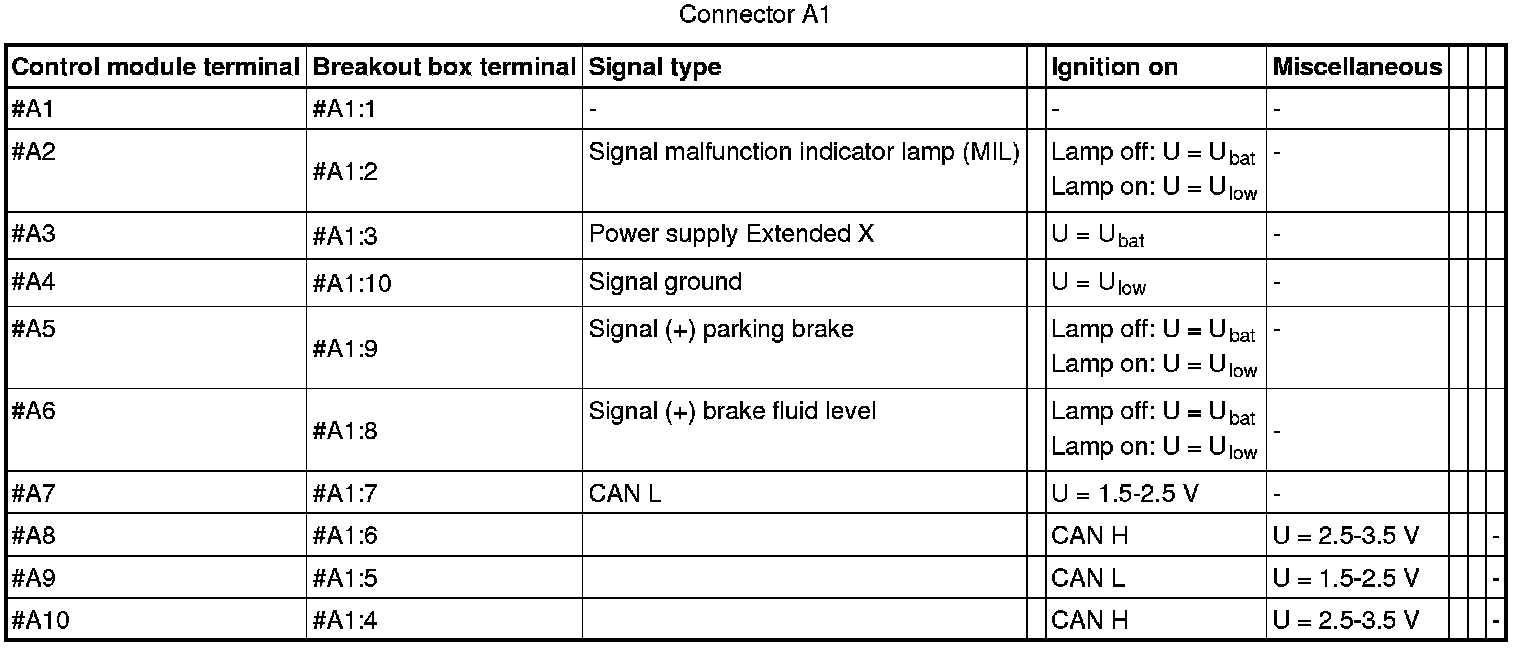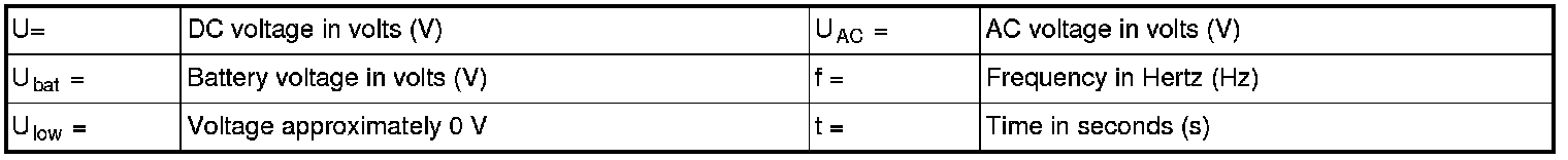 All the values given below apply between the respective connection (column 1) and signal ground (#A1 : 10). If this is not the case, it is indicated in brackets.