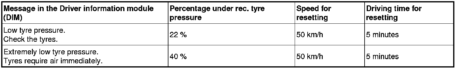 To reset a warning it is easiest to stop the vehicle and fill air in the tire where the air pressure is low. In order for the warning to reset air has to be filled so that the air pressure reaches a level that corresponds to at least 95% of the recommended air pressure, and then drive the vehicle faster than 40 km/h (25 mph) for more than 10 minutes, accumulated time.