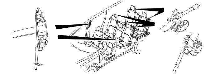 Depending on the model and market, there may be up to seven seat belt tensioners in the vehicle. Two in the front seat, three in the rear seats and two in the third row if applicable. The seat belt tensioners contain an explosive charge which tensions the seat belts when deployed. The seat belt tensioners are separated from each other electrically. This means that each seat belt tensioner has a separate individual power supply and ground from the control module.