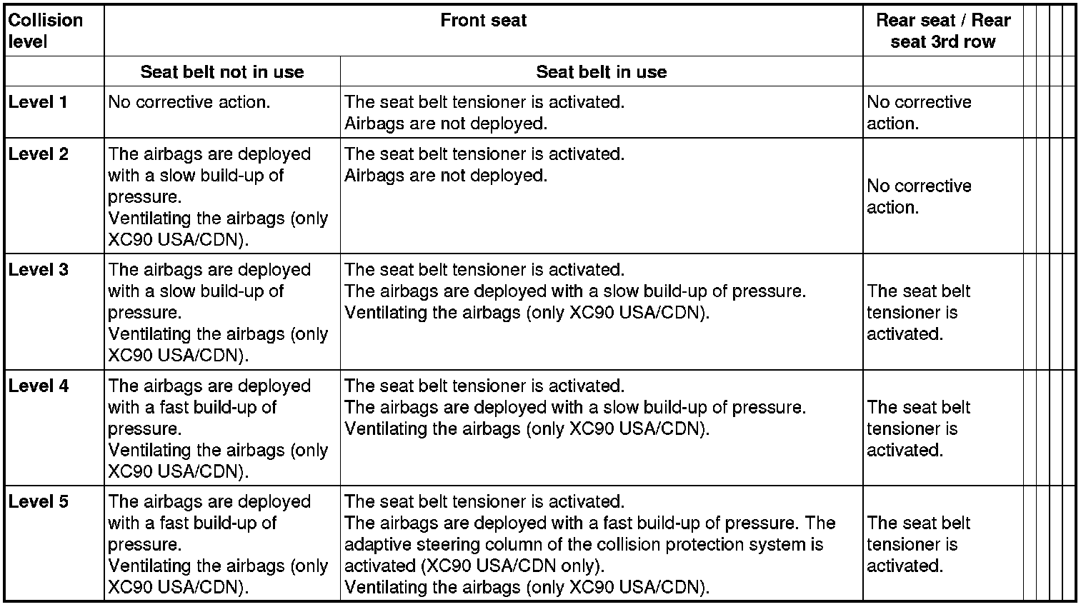 The table below shows how the SRS system reacts in the event of a frontal impact.