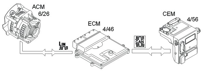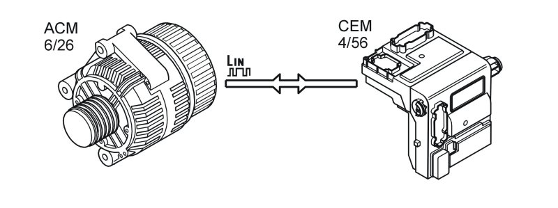 Depending on the model year and type of engine management system, the charge regulator (also known as the alternator control module (ACM)) is connected to either the central electronic module (CEM) or the engine control module (ECM). It communicates via LIN communication. For information on connection, see the illustration above and the wiring diagram.